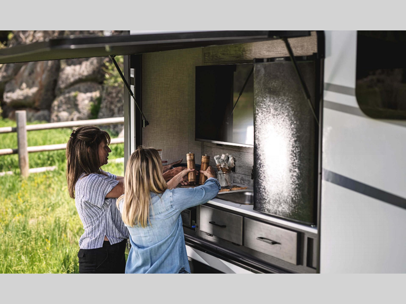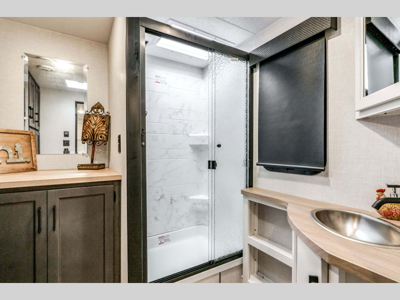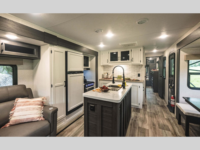 Sleeps 4 Slides 3 Length 36 ft 10 in Ext Width 8 ft Ext Height 11 ft 6 in Int Height 6 ft 10 in Interior Color Blake, Doe Hitch Weight 1200 lbs GVWR 10810 lbs Dry Weight 9010 lbs Cargo Capacity 1800 lbs Fresh Water Capacity 45 gals Grey Water Capacity 32 gals Black Water Capacity 32 gals Tire Size 15" Furnace BTU 30000 btu Available Beds King Refrigerator Type 12V Refrigerator Size 10 cu ft Cooktop Burners 3 Shower Size 30" x 36" Number of Awnings 2 Axle Weight 7810 lbs LP Tank Capacity 30 lbs Water Heater Type On Demand Tankless AC BTU 15000 btu TV Info LR Smart TV Awning Info 10' 4" and 16' Power w/ LED Lights Axle Count 2 Washer/Dryer Available Yes Number of LP Tanks 2 Shower Type Standard Electrical Service 50 amp Similar Floorplans