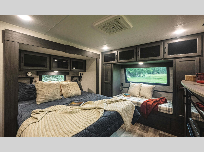 A PVC roof membrane covers protects the top of these units and a heated and enclosed underbelly protects the bottom. The RV airflow A/C system increases the 15,000 BTU air flow by an average of 40% for an improved performance, faster cooling time, and reduction of noise. You will also appreciate the 200W solar panel for off-grid capabilities, and the leveling system will have you set up at camp in no-time!