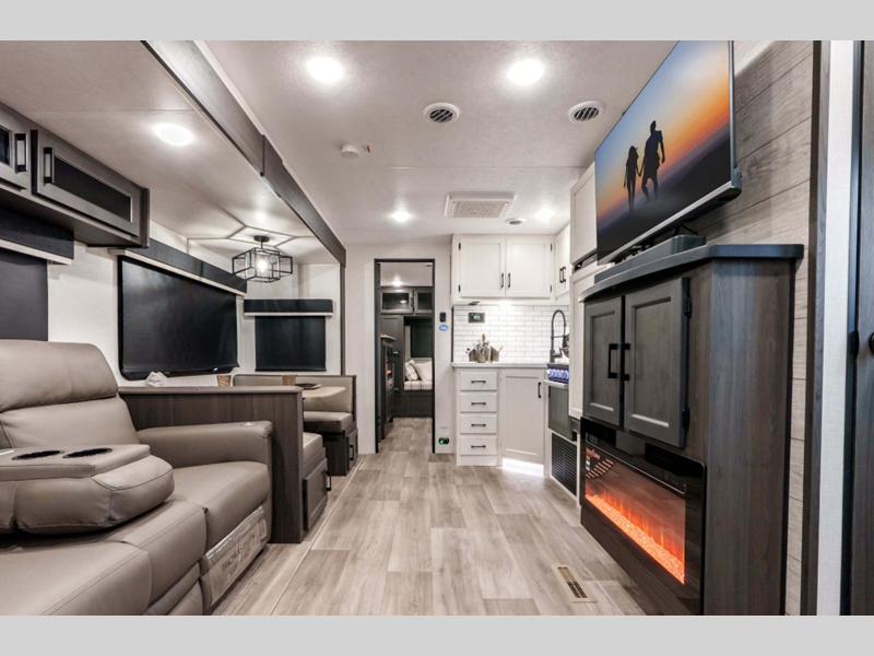Sleeps 5 Slides 2 Length 34 ft 8 in Ext Width 8 ft Ext Height 11 ft 4 in Int Height 6 ft 10 in Interior Color Blake, Doe Hitch Weight 890 lbs GVWR 9255 lbs Dry Weight 8020 lbs Cargo Capacity 1235 lbs Fresh Water Capacity 45 gals Grey Water Capacity 64 gals Black Water Capacity 32 gals Tire Size 15" Furnace BTU 30000 btu Available Beds King Refrigerator Type 12V Refrigerator Size 10 cu ft Cooktop Burners 3 Shower Size 30" x 36" Number of Awnings 1 Axle Weight 7130 lbs LP Tank Capacity 30 lbs Water Heater Type On Demand Tankless AC BTU 15000 btu TV Info LR Smart TV, BR TV, Ext. 40" TV Awning Info 14' Power w/ LED Lights Axle Count 2 Number of LP Tanks 2 Shower Type Standard Electrical Service 50 amp Similar Floorplans