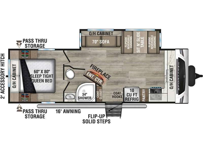 Every Venture RV SportTrek lightweight travel trailer is constructed to offer peace of mind and the comforts of home! Their purposeful residential kitchens are packed with handy features like a Furrion oven and three burner cooktop, a large stainless steel sink with a cover and dish drying rack, plus a 12V refrigerator. You will find plenty of storage throughout, including Safe-Tek hidden storage with a charging center and StorMore nightstands on either side of the bed behind the full-length closets. And the magnetic slam-latch baggage doors and spacious pass-through storage area will hold your outdoor gear in place. They even come with a hot and cold exterior shower and SporTrek's Weather Shield which includes a forced air heated and enclosed underbelly, high output A/C ducting, and more features that will let you extend your camping season. You will also love the new residential upgraded furniture, Serta memory foam mattress, barn style passage doors, and many more comforts!