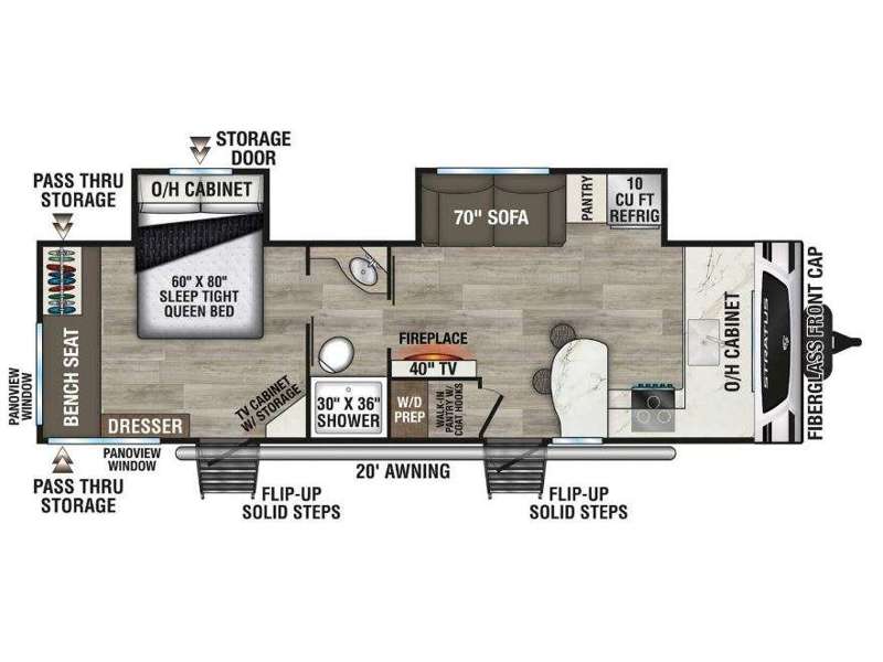 Sleep tight in this travel trailer with a sleep tight queen bed in the rear private bedroom! Freshen up each morning in the full bathroom featuring a 30" x 36" shower, then head to the kitchen and fry some eggs using the three burner cooktop. You can enjoy your meals at the front 88" x 42" U-shaped dinette, as well as transform it into an extra sleeping space when needed. The 70" sofa offers a comfortable place for an afternoon nap and for watching a movie with the entertainment center opposite. Behind the entertainment center there is a walk-in pantry with coat hooks for double use. Don't leave behind any outdoor gear, simply store it in the exterior pass-through storage area!